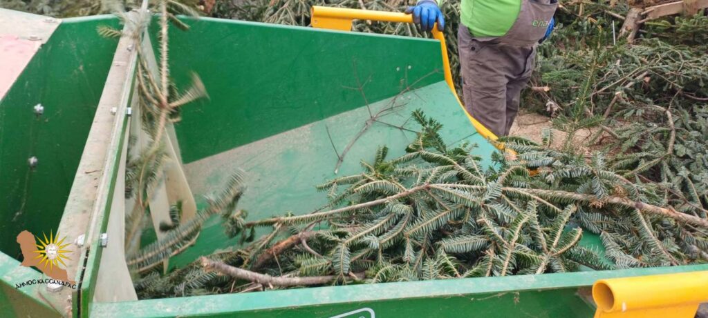 Στη συνέχεια, τα χριστουγεννιάτικα δέντρα οδηγήθηκαν σε ειδικό μηχάνημα κλαδοτεμαχιστή και θρυμματιστή κλαδιών, όπου έγινε η επεξεργασία τους. Το παραγόμενο υλικό μεταφέρθηκε στη μονάδα κομποστοποίησης του ΦΟΔΣΑ Κεντρικής Μακεδονίας, προκειμένου να μετατραπεί σε χρήσιμο οργανικό υλικό κομπόστ.