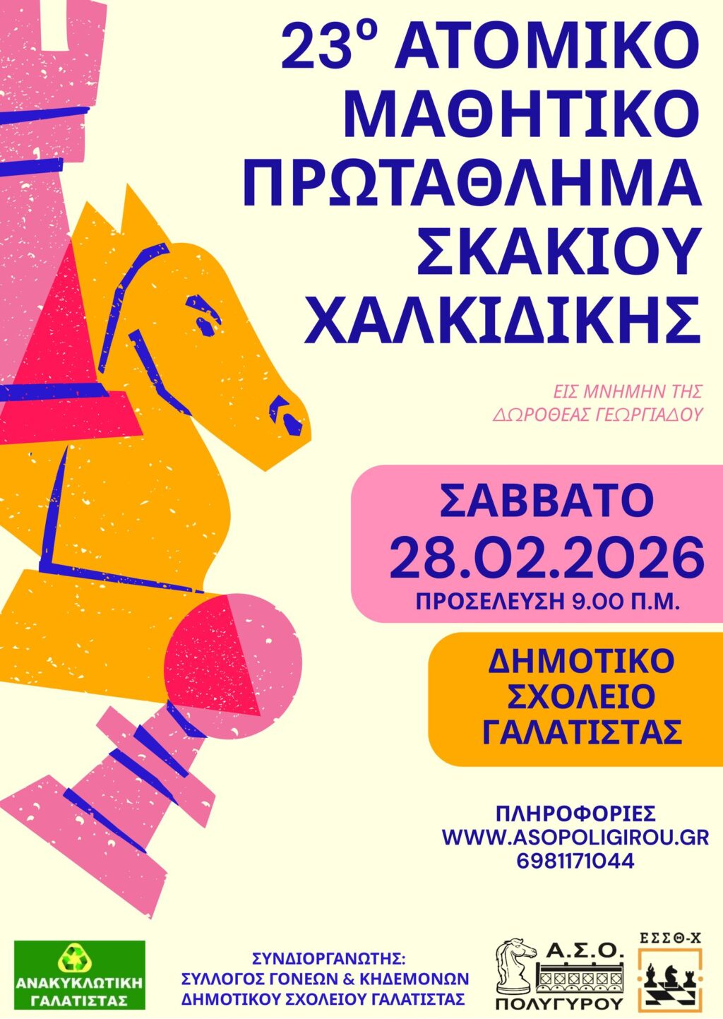 Το «23ο Ατομικό Μαθητικό Πρωτάθλημα Σκακιού Χαλκιδικής» διοργανώνει ο ΑΣΟ Πολυγύρου, σε συνεργασία με την Ένωση Σκακιστικών Σωματείων Θεσσαλονίκης – Χαλκιδικής και τον Σύλλογο Γονέων και Κηδεμόνων Δημοτικού Σχολείου Γαλάτιστας, το Σάββατο 28 Φεβρουαρίου 2026, από τις 10:00 έως τις 15:00, στο Δημοτικό Σχολείο Γαλάτιστας.