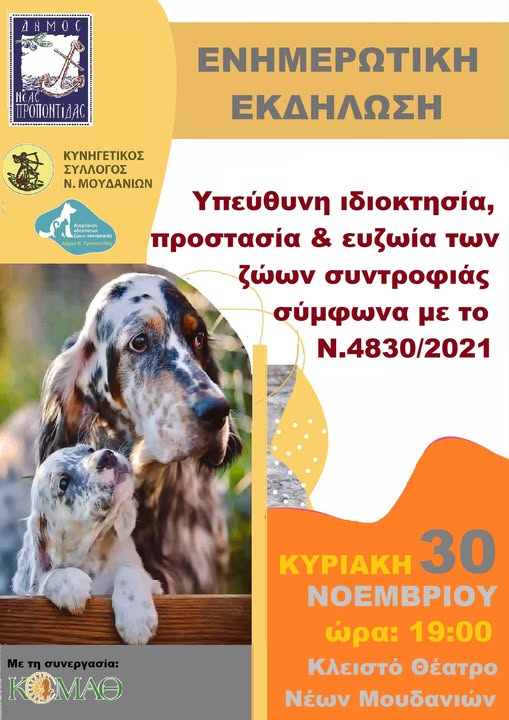 Ο Κυνηγετικός Σύλλογος Νέων Μουδανιών και ο Δήμος Νέας Προποντίδας – Τμήμα Διαχείρισης Ζώων Συντροφιάς, σε συνεργασία με την Κυνηγετική Ομοσπονδία Μακεδονίας Θράκης (ΚΟΜΑΘ), διοργανώνουν ενημερωτική εκδήλωση με θέμα «Υπεύθυνη ιδιοκτησία, προστασία και ευζωία των ζώων συντροφιάς σύμφωνα με τον ν. 4830/2021».