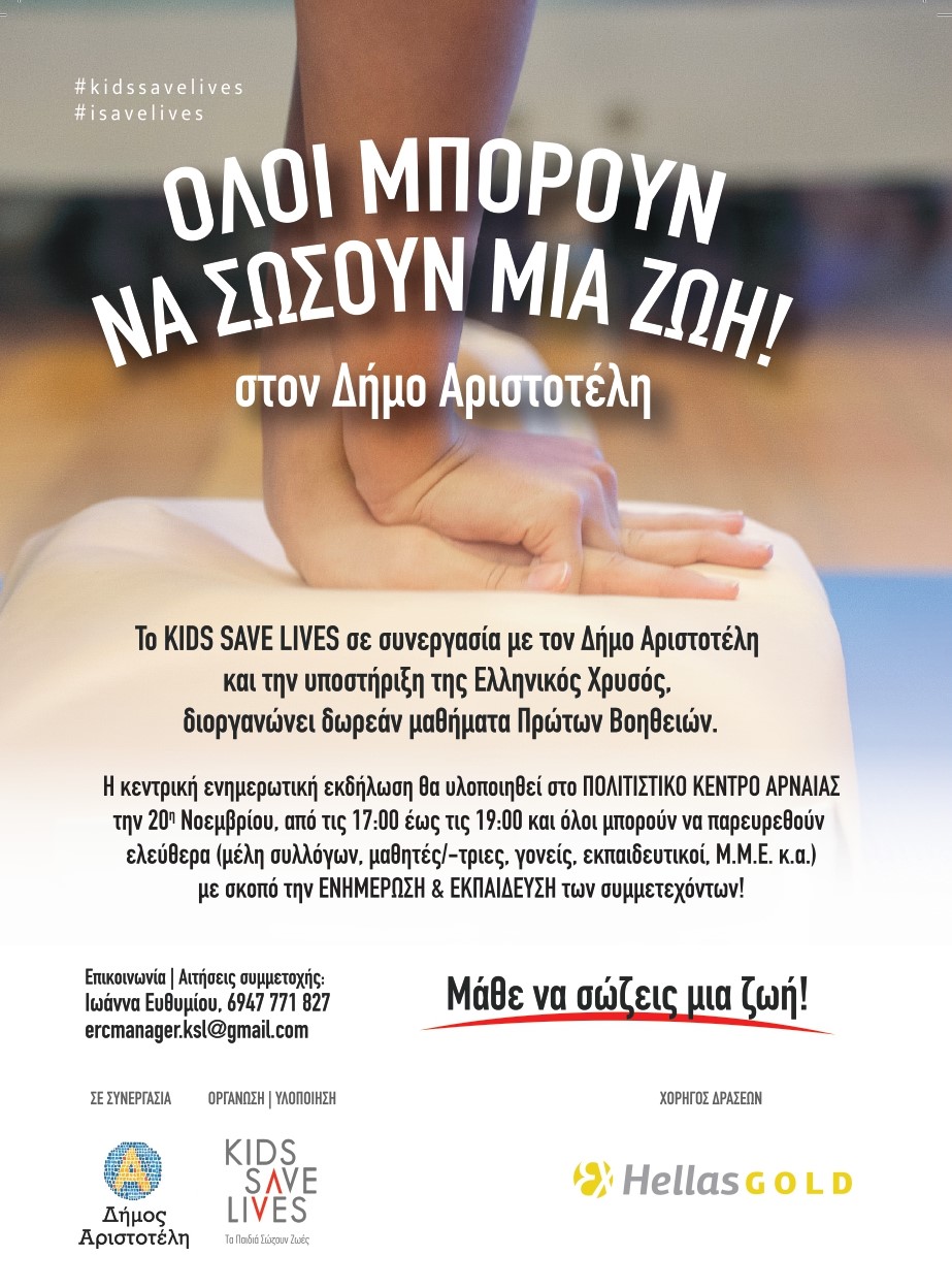 Η Ανθρωπιστική Οργάνωση KIDS SAVE LIVES – ΤΑ ΠΑΙΔΙΑ ΣΩΖΟΥΝ ΖΩΕΣ, σε συνεργασία με τον Δήμο Αριστοτέλη και με χορηγό δράσεων την εταιρεία Ελληνικός Χρυσός, διοργανώνει μια σημαντική εκδήλωση αφιερωμένη στην προστασία της ανθρώπινης ζωής. Η εκδήλωση θα πραγματοποιηθεί την Πέμπτη 20 Νοεμβρίου, από τις 17:00 έως τις 19:00, στο Πολιτιστικό Κέντρο Αρναίας, και είναι ανοικτή σε όλους τους πολίτες.