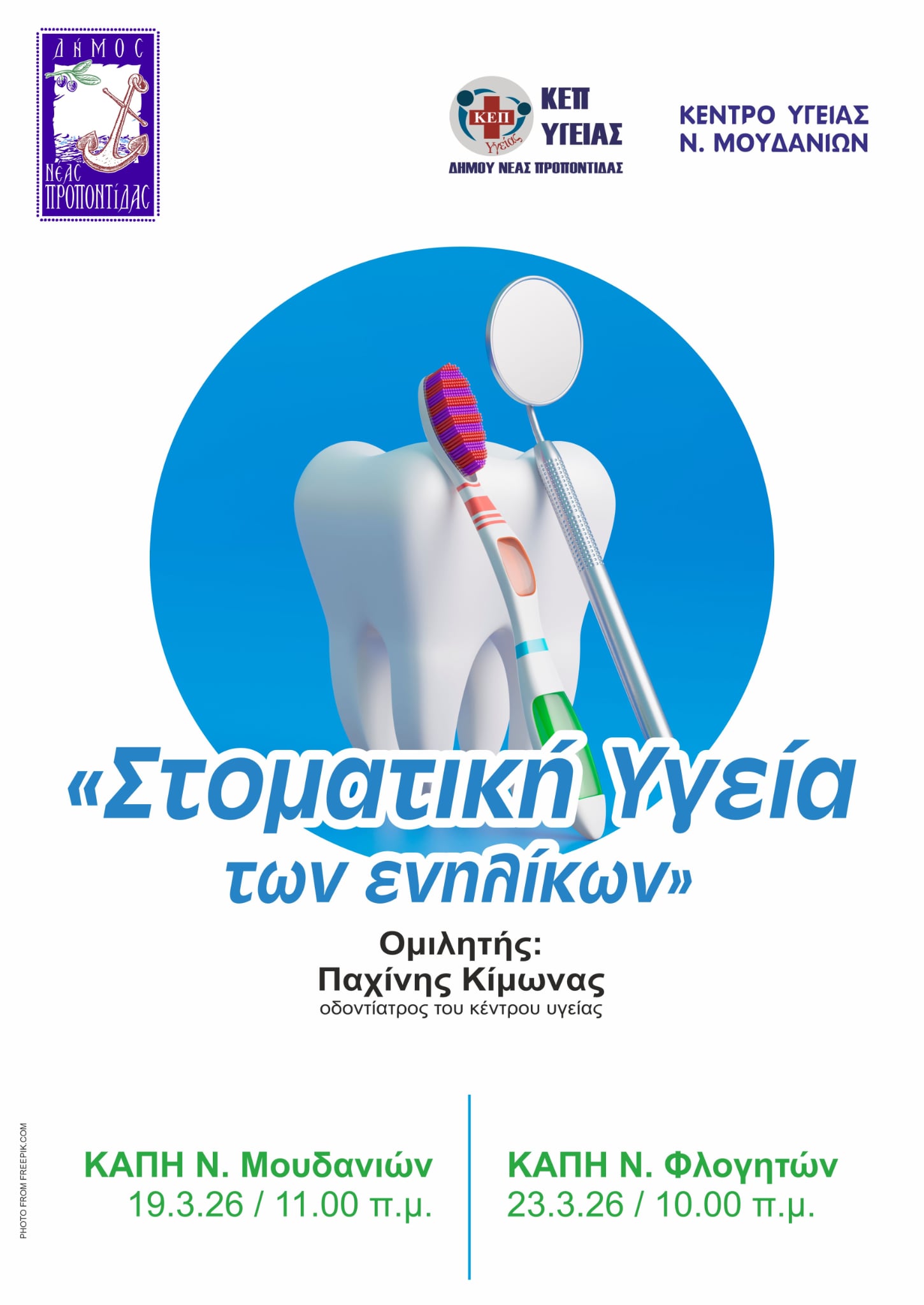 Ενημερωτική ομιλία με θέμα «Στοματική Υγεία των Ενηλίκων» διοργανώνει ο Δήμος Νέας Προποντίδας σε συνεργασία με το ΚΕΠ Υγείας Δήμου Νέας Προποντίδας και το Κέντρο Υγείας Νέων Μουδανιών.