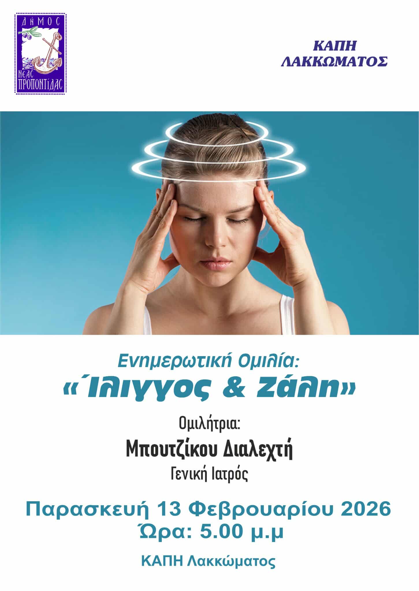 Ενημερωτική ομιλία με θέμα «Ίλιγγος & Ζάλη» διοργανώνει το ΚΑΠΗ Λακκώματος του Δήμου Νέας Προποντίδας, στο πλαίσιο των δράσεων πρόληψης και προαγωγής της υγείας.