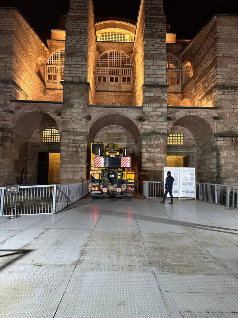 Η εμφάνιση βαρέων γερανοφόρων φορτηγών μέσα στην Αγία Σοφία προκαλεί ανησυχίες σχετικά με τον τρόπο που πραγματοποιείται η τελευταία φάση των εργασιών αποκατάστασης, τόσο σε μέσα της Ελλάδας, αλλά και στην Τουρκία.