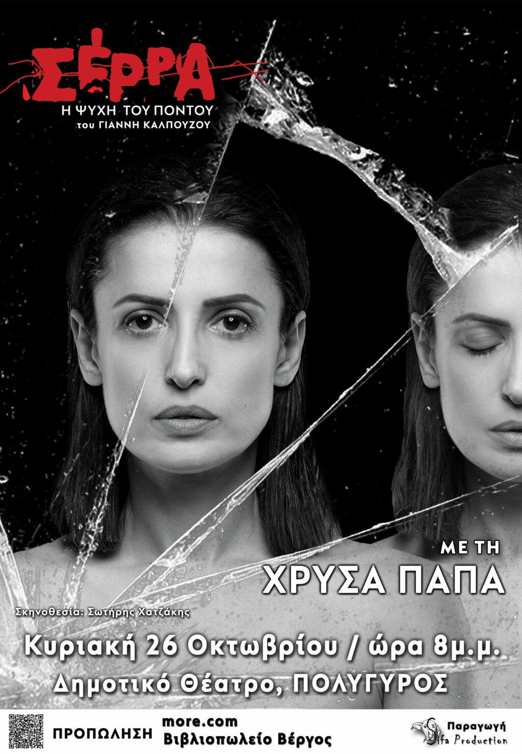 Η παράσταση “Σέρρα-Η ψυχή του Πόντου”, βασισμένη στο ομώνυμο μυθιστόρημα του Γιάννη Καλπούζου, με την εξαιρετική ερμηνεία της Χρύσας Παπά, συνεχίζει για τέταρτη χρονιά την Πανελλαδική και Ευρωπαϊκή της περιοδεία, κάνοντας μια στάση στον Πολύγυρο, την Κυριακή 26 Οκτωβρίου 2025, ώρα 8μμ.