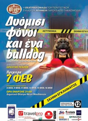 Η θεατρική ομάδα του Πολιτιστικού Συλλόγου ΑΠΑΜΕΙΑ παρουσιάζει την ξεκαρδιστική κωμωδία “Δύομισι φόνοι και ένα bulldog” των Ρέππα – Παπαθανασίου, σε διασκευή και σκηνοθεσία του Ορέστη Τεάζη.