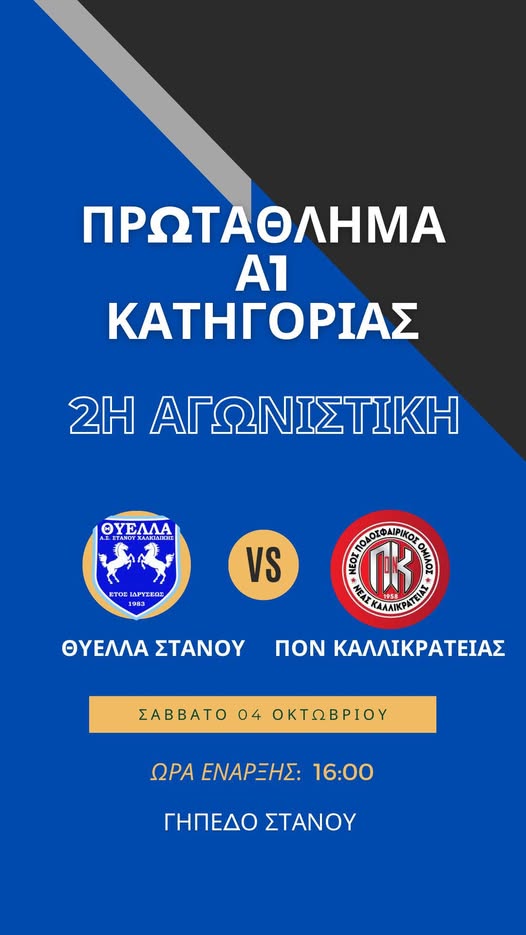 Η μεγάλη στιγμή για τη Θύελλα Στανού έφτασε! Το Σάββατο 4 Οκτωβρίου, στις 16:00, η ομάδα δίνει τον πρώτο της αγώνα για το φετινό πρωτάθλημα της Α1’ κατηγορίας της ΕΠΣ Χαλκιδικής, υποδεχόμενη τον ΠΟΝ Καλλικράτειας στο γήπεδο του Στανού.