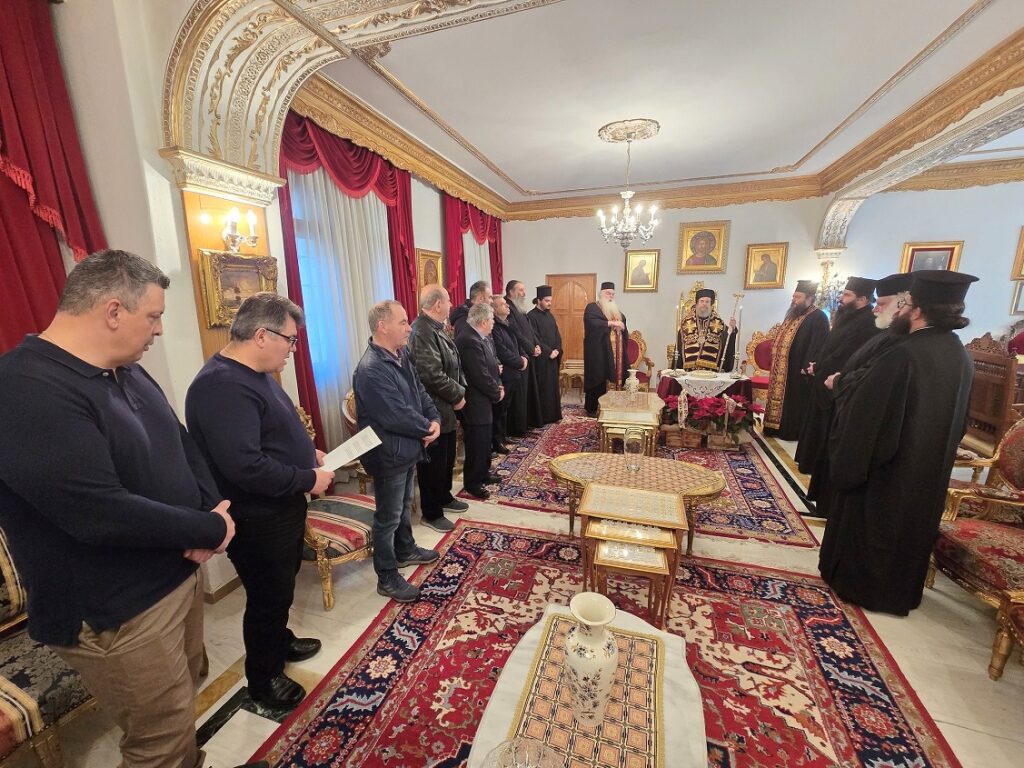 Παρόντες ο Πρωτοσύγκελλος Παν. Αρχιμ. π. Ιγνάτιος Ριγανάς, ο Γενικός Αρχιερατικός Επίτροπος Παν. Αρχιμ. π. Δωρόθεος Ζέρβας, οι συνεργάτες του Μητροπολίτη στα Γραφεία μας Παν. Αρχιμ. π. Νικόδημος Κωτινούδης, Αιδ. Οικ. π. Γεώργιος Τρικκαλιώτης, κ. Πετρος Κοτρότσιος, κ. Κοσμάς Ζαμπούνης, κ. Δημήτριος Χρήστου και κ. Πέτρος Χρηστίδης .