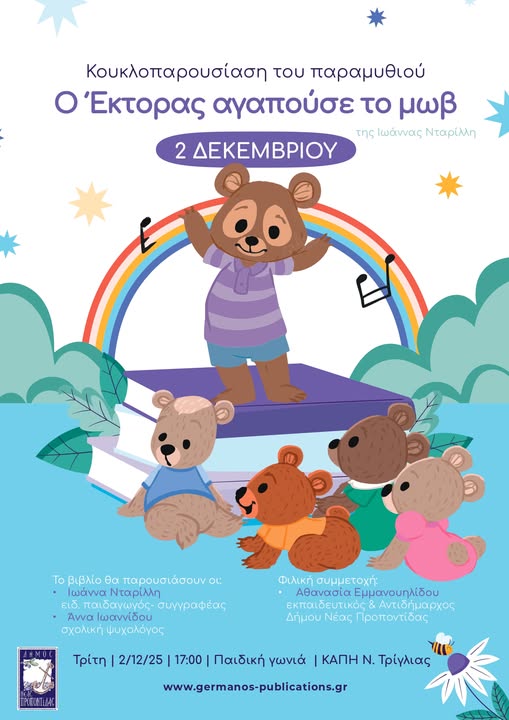 Μια ξεχωριστή διαδραστική κουκλοπαρουσίαση για παιδιά θα πραγματοποιηθεί την Τρίτη 2 Δεκεμβρίου 2025, στις 17:00, στο ΚΑΠΗ Νέας Τρίγλιας. Το αγαπημένο παραμύθι της Ιωάννας Νταρίλλη «Ο Έκτορας αγαπούσε το μοβ» ζωντανεύει μέσα από μια εκδήλωση που υπόσχεται χρώμα, παιχνίδι και όμορφα μηνύματα για τους μικρούς θεατές και τους γονείς τους.