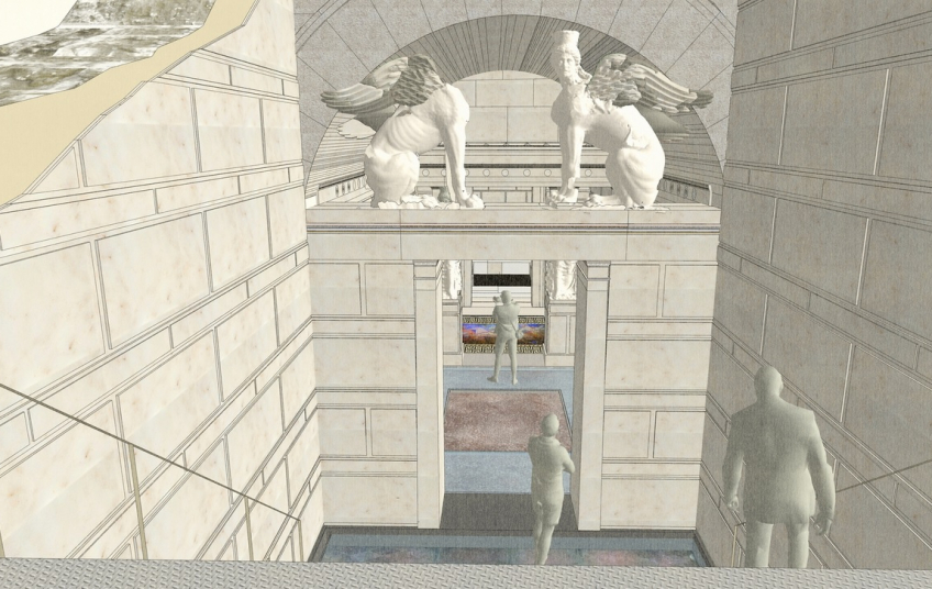 Στο εσωτερικό του μνημείου, διαμορφώνονται υπερυψωμένα δάπεδα πρόσβασης με βαθμίδες, τα οποία οδηγούν στο γυάλινο δάπεδο, που θα καλύπτει το βοτσαλωτό του Χώρου 1, ενώ στον Χώρο 2, θα κατασκευαστεί περιμετρικός διάδρομος με γυάλινο δάπεδο για την θέαση των Καρυάτιδων και του τρίτου χώρου, όπου βρίσκεται το ψηφιδωτό της «Αρπαγής της Περσεφόνης».