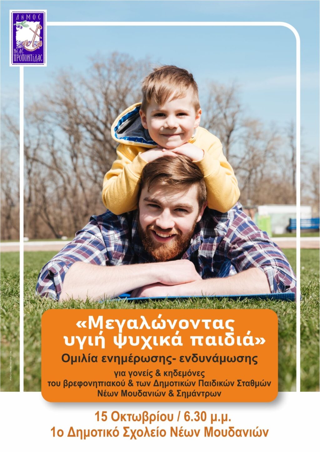 Ο Δήμος Νέας Προποντίδας διοργανώνει σημαντική ομιλία για γονείς και κηδεμόνες με θέμα «Μεγαλώνοντας υγιή ψυχικά παιδιά», στο πλαίσιο της στήριξης της οικογένειας και της ενίσχυσης της ψυχοκοινωνικής ανάπτυξης των παιδιών.