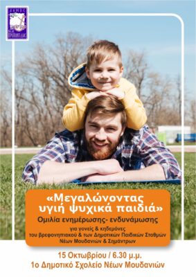 Με θέμα «Μεγαλώνοντας υγιή ψυχικά παιδιά», ο Δήμος διοργανώνει εκδήλωση για τους γονείς των βρεφονηπιακών και δημοτικών παιδικών σταθμών