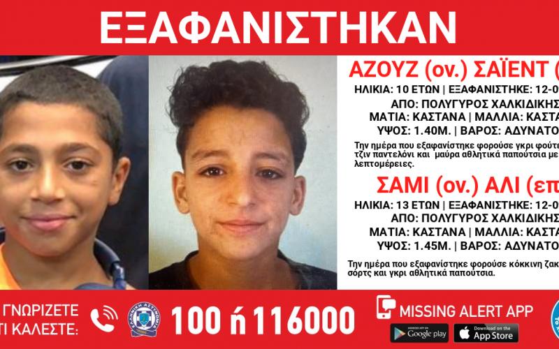 Συναγερμός σήμανε στις αρχές για την εξαφάνιση δύο ανήλικων αγοριών από τον Πολύγυρο Χαλκιδικής.