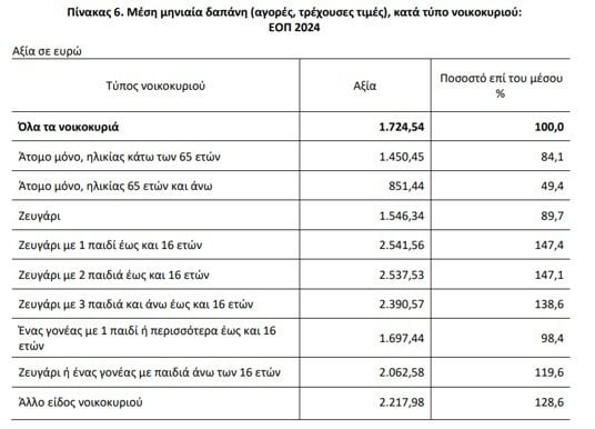 H Ελληνική Στατιστική Αρχή δημοσίευσε σήμερα τα νεότερα στοιχεία της Έρευνας Οικογενειακών Προϋπολογισμών 2024. Σύμφωνα με τα επίσημα δεδομένα, η μέση μηνιαία δαπάνη για ένα ζευγάρι χωρίς παιδιά ανέρχεται σε 1.546,34 ευρώ, ενώ για ζευγάρι με ένα παιδί έως 16 ετών διαμορφώνεται στα 2.541,56 ευρώ.