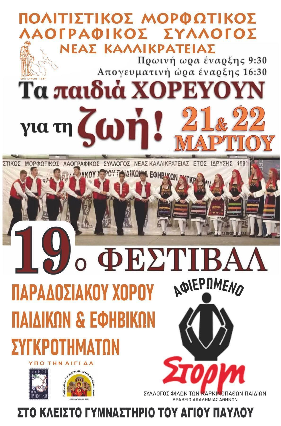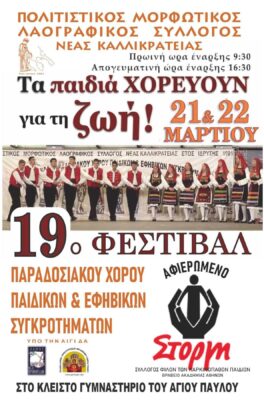 Με το σύνθημα «Τα παιδιά χορεύουν για τη ζωή», ο Πολιτιστικός Μορφωτικός Λαογραφικός Σύλλογος Νέας Καλλικράτειας διοργανώνει το 19ο Φεστιβάλ Παραδοσιακού Χορού Παιδικών και Εφηβικών Συγκροτημάτων, προσκαλώντας το κοινό σε μια μεγάλη γιορτή πολιτισμού, παράδοσης και προσφοράς.