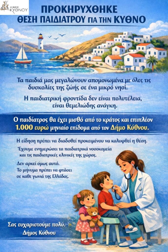 Σε αγώνα δρόμου βρίσκεται ο Δήμος Κύθνου για την κάλυψη των αυξημένων υγειονομικών αναγκών του νησιού, προκηρύσσοντας θέση παιδιάτρου με επιπλέον οικονομικό κίνητρο. Συγκεκριμένα, ο Δήμος ανακοίνωσε ότι προσφέρει 1.000 ευρώ μηνιαίως επιπλέον του μισθού, προκειμένου να προσελκύσει γιατρό στο νησί.