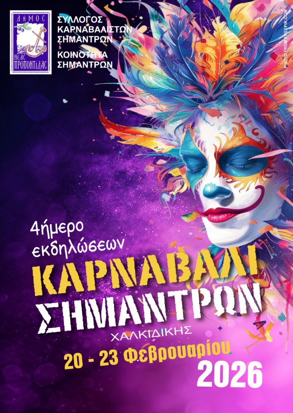 Παρασκευή 20/02/2026 – Κεντρική Πλατεία Σημάντρων: Παρέλαση με το λάβαρο του Συλλόγου και την παραδοσιακή καμήλα (17:00), κήρυξη έναρξης από τον Δήμαρχο, παρουσίαση χορευτικών από τη σχολή Be Fit Club, λαϊκή ορχήστρα με Πόλυ Πλευρίτη στο κλαρίνο (19:00)