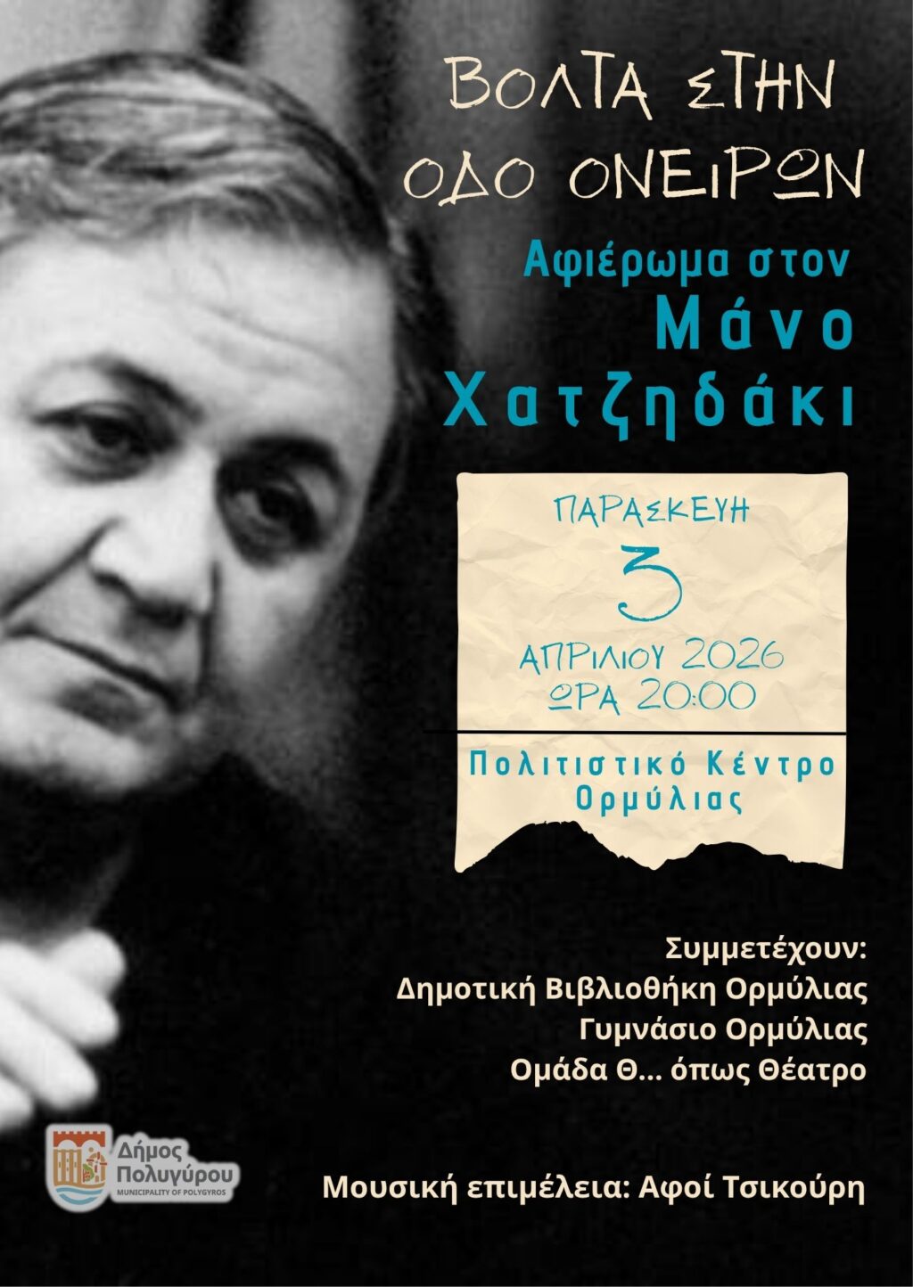 Μια ξεχωριστή μουσική εκδήλωση αφιερωμένη στον Μάνο Χατζιδάκι παρουσιάζεται στον Δήμο Πολυγύρου, με τίτλο «Βόλτα στην Οδό Ονείρων».